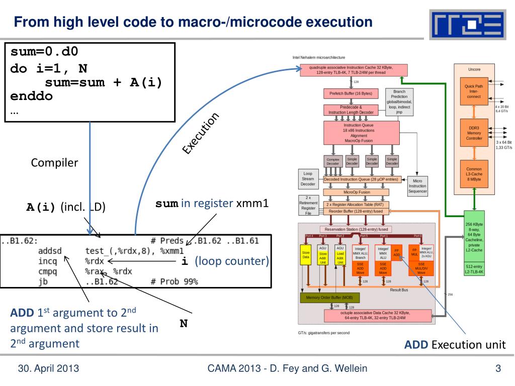 From high level code to macro-/microcode execution sum=0.d0 do i=1, N sum=sum + A(i)enddo… Execution Compiler sumin register xmm1 A(i) (incl. LD) i(loop counter) ADD 1st argument to 2nd argument and store result in 2nd argument N ADD Execution unit CAMA 2013 - D. Fey and G. Wellein