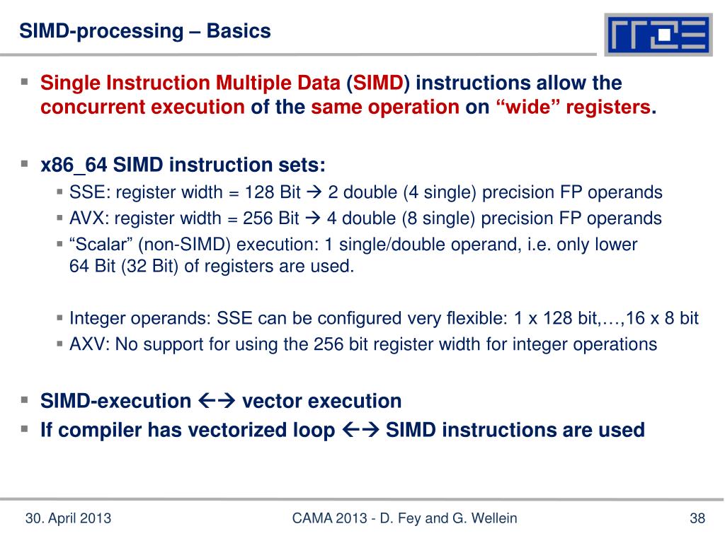 SIMD-processing – Basics • Single Instruction Multiple Data (SIMD) instructions allow the concurrent execution of the same operation on “wide” registers. • x86_64 SIMD instruction sets: • SSE: register width = 128 Bit 2 double (4 single) precision FP operands • AVX: register width = 256 Bit 4 double (8 single) precision FP operands • “Scalar” (non-SIMD) execution: 1 single/double operand, i.e. only lower 64 Bit (32 Bit) of registers are used. • Integer operands: SSE can be configured very flexible: 1 x 128 bit,…,16 x 8 bit • AXV: No support for using the 256 bit register width for integer operations • SIMD-execution vector execution • If compiler has vectorized loop SIMD instructions are used CAMA 2013 - D. Fey and G. Wellein