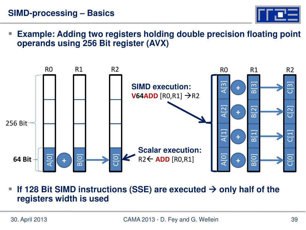 SIMD-processing – Basics • Example: Adding two registers holding double precision floating point operands using 256 Bit register (AVX) • If 128 Bit SIMD instructions (SSE) are executed only half of the registers width is used R0 R1 R2 R0 R1 R2 SIMD execution: V64ADD [R0,R1] R2 + + 256 Bit C[3] A[3] B[3] + C[2] Scalar execution: R2 ADD [R0,R1] A[2] B[2] 64 Bit + + C[1] A[1] B[1] C[0] A[0] B[0] C[0] A[0] B[0] CAMA 2013 - D. Fey and G. Wellein