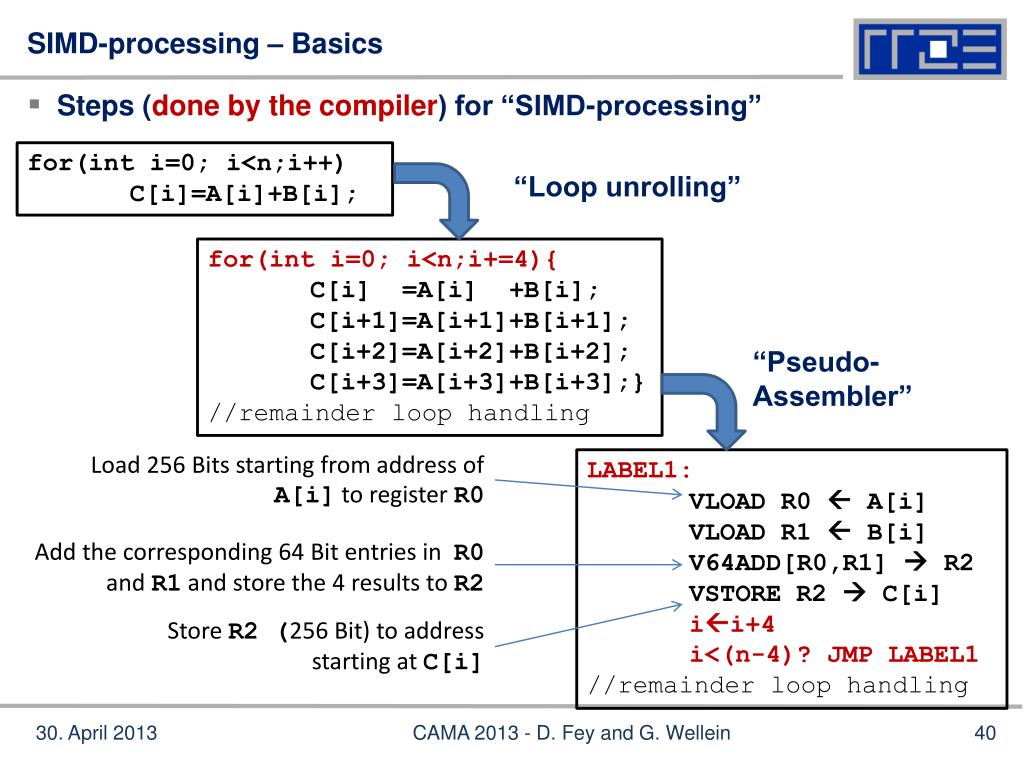 Software pipelining a[i]=a[i]*c; N=12 Naive instruction issue Optimized instruction issue load a[1]load a[2]load a[3]load a[4]load a[5]mult a[1]=c,a[1]load a[6] mult a[2]=c,a[2]load a[7] mult a[3]=c,a[3]store a[1]load a[8] mult a[4]=c,a[4]store a[2]load a[9] mult a[5]=c,a[5]store a[3] load a[10] mult a[6]=c,a[6] store a[4] load a[11] mult a[7]=c,a[7] store a[5]load a[12] mult a[8]=c,a[8] store a[6] mult a[9]=c,a[9] store a[7] mult a[10]=c,a[10] store a[8] mult a[11]=c,a[11] store a[9] mult a[12]=c,a[12] store a[10] store a[11] store a[12] Cycle 1Cycle 2Cycle 3Cycle 4Cycle 5Cycle 6Cycle 7Cycle 8Cycle 9Cycle 10Cycle 11Cycle 12Cycle 13Cycle 14Cycle 15Cycle 16Cycle 17Cycle 18Cycle 19 load a[1] mult a[1]=c,a[1]store a[1]load a[2]mult a[2]=c,a[2]store a[2]load a[3] Prolog Kernel Epilog T= 19 cycles T= 96 cycles CAMA 2013 - D. Fey and G. Wellein