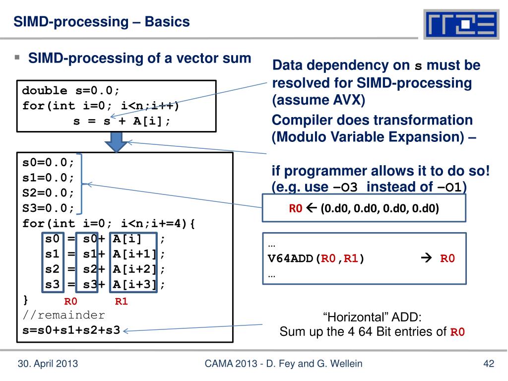 Compiler generated AVX code (loop body) Baseline version (“scalar”): No pipelining – no SIMD 3 cycles / Iteration Compiler generated “AVX version” (-O3 –xAVX): SIMD processing: vaddpd%ymm8 4 dp operands(4-way unrolling) Pipelining: 8-way MVE of SIMD code 0.25 cycles / Iteration 32-way unrolling in total CAMA 2013 - D. Fey and G. Wellein