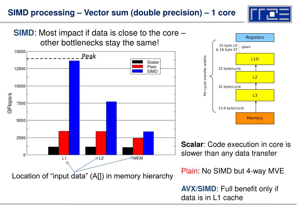 SIMD processing – Vector sum (double precision) – 1 core SIMD: Most impact if data is close to the core – other bottlenecks stay the same! Peak Scalar: Code execution in core is slower than any data transfer Plain: No SIMD but 4-way MVE AVX/SIMD: Full benefit only if data is in L1 cache Location of “input data” (A[]) in memory hierarchy