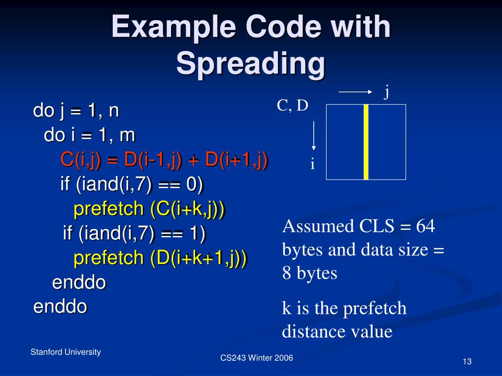 do j = 1, n do i = 1, m C(i,j) = D(i-1,j) + D(i+1,j) if (iand(i,7) == 0) prefetch (C(i+k,j)) if (iand(i,7) == 1) prefetch (D(i+k+1,j)) enddo enddo Example Code with Spreading j C, D i Assumed CLS = 64 bytes and data size = 8 bytes k is the prefetch distance value