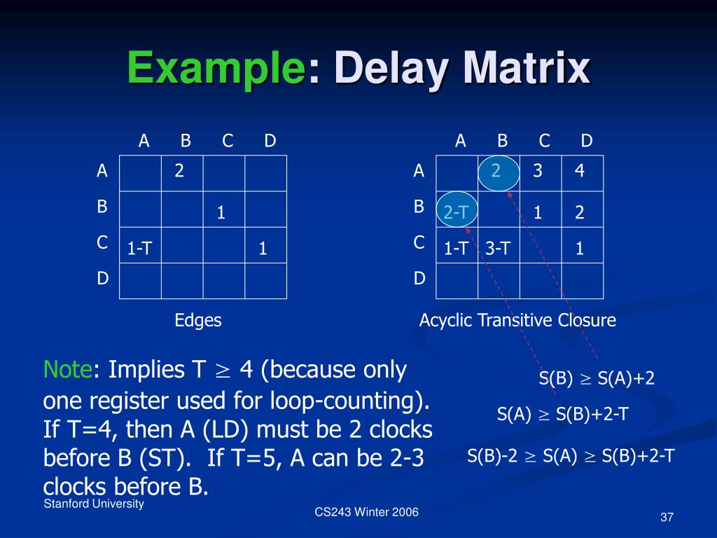 A A B B C C D D A A 2 2 B B 1 1 C C 1-T 1-T 1 1 D D S(B) ≥S(A)+2 S(A) ≥S(B)+2-T Example: Delay Matrix 3 4 2-T 2 3-T Edges Acyclic Transitive Closure Note: Implies T ≥ 4 (because only one register used for loop-counting). If T=4, then A (LD) must be 2 clocks before B (ST). If T=5, A can be 2-3 clocks before B. S(B)-2 ≥ S(A) ≥S(B)+2-T