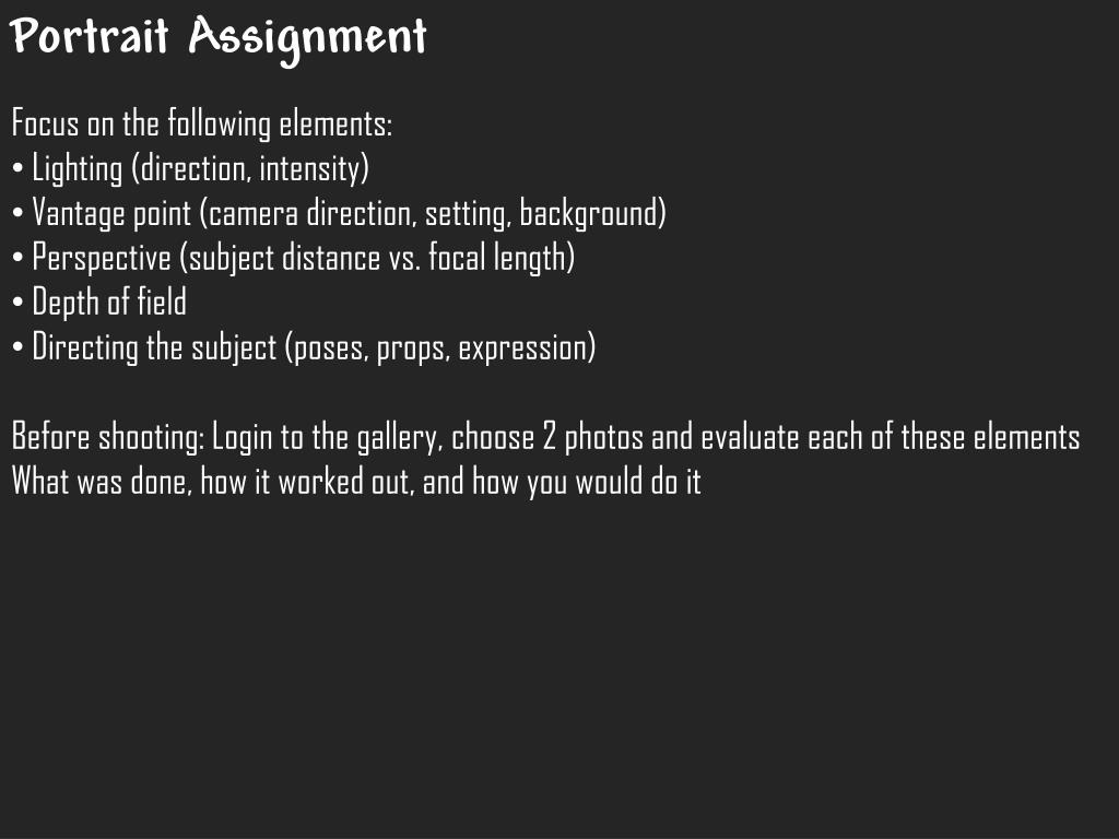 Portrait Assignment • Focus on the following elements: • Lighting (direction, intensity) • Vantage point (camera direction, setting, background) • Perspective (subject distance vs. focal length) • Depth of field • Directing the subject (poses, props, expression) • Before shooting: Login to the gallery, choose 2 photos and evaluate each of these elements • What was done, how it worked out, and how you would do it