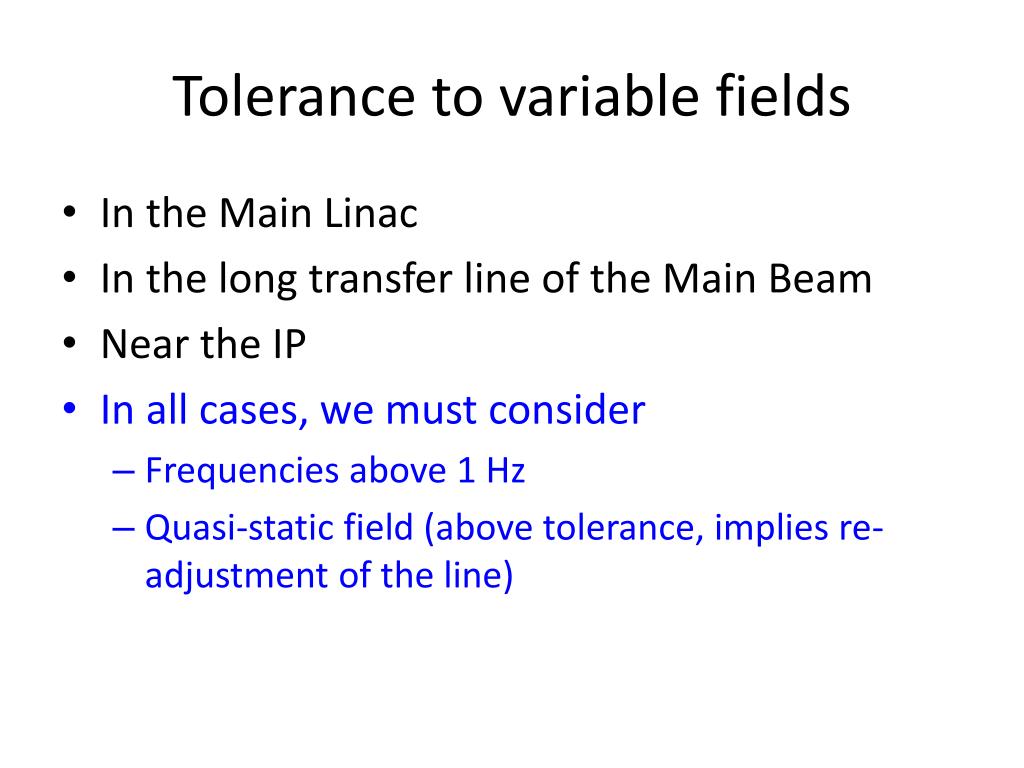 Tolerance to variable fields • In the Main Linac • In the long transfer line of the Main Beam • Near the IP • In all cases, we must consider • Frequencies above 1 Hz • Quasi-static field (above tolerance, implies re-adjustment of the line)