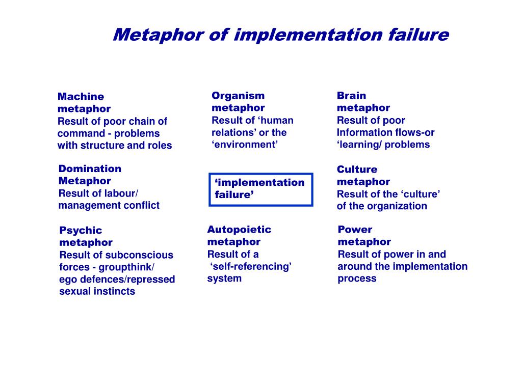 Organism metaphor Result of ‘human relations’ or the ‘environment’ Brain metaphor Result of poor Information flows-or ‘learning/ problems Machine metaphor Result of poor chain of command - problems with structure and roles Domination Metaphor Result of labour/ management conflict Culture metaphor Result of the ‘culture’ of the organization ‘implementation failure’ Autopoietic metaphor Result of a ‘self-referencing’ system Power metaphor Result of power in and around the implementation process Psychic metaphor Result of subconscious forces - groupthink/ ego defences/repressed sexual instincts Metaphor of implementation failure
