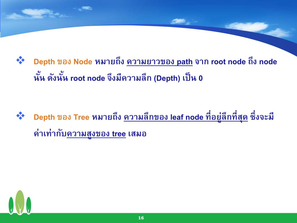 Depth ของ Nodeหมายถึง ความยาวของ pathจาก root node ถึง node นั้น ดังนั้น root node จึงมีความลึก (Depth) เป็น 0 • Depth ของ Treeหมายถึง ความลึกของ leaf node ที่อยู่ลึกที่สุด ซึ่งจะมีค่าเท่ากับความสูงของ treeเสมอ