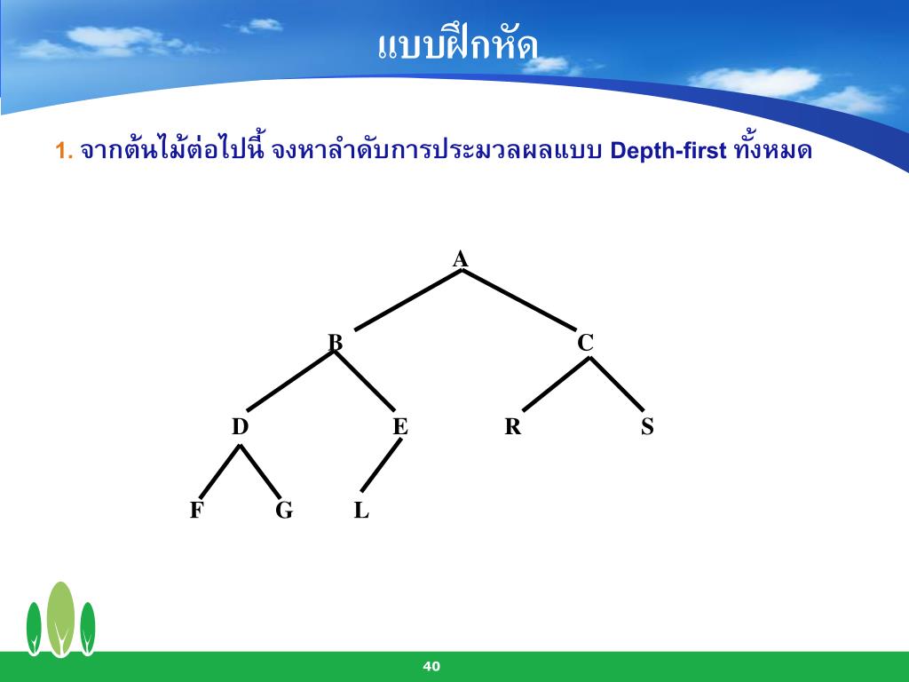 A B C D E R S F G L แบบฝึกหัด 1. จากต้นไม้ต่อไปนี้ จงหาลำดับการประมวลผลแบบ Depth-first ทั้งหมด
