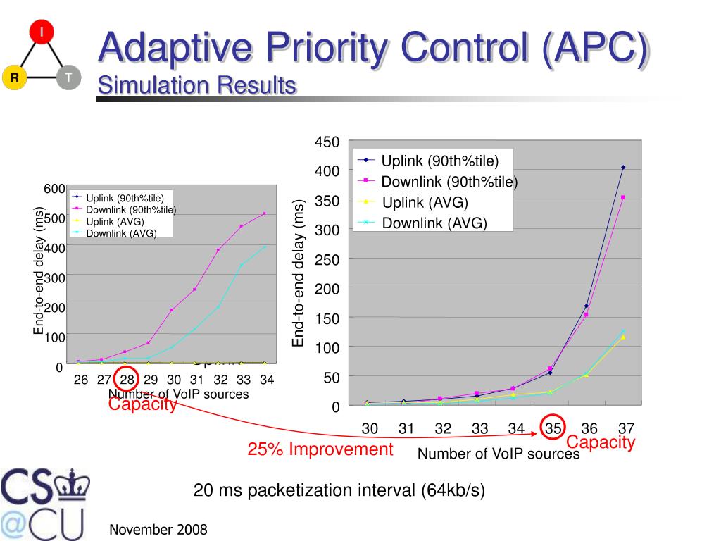 600 450 Uplink (90th%tile) Uplink (90th%tile) 400 Downlink (90th%tile) Downlink (90th%tile) 500 Uplink (AVG) 350 Uplink (AVG) Downlink (AVG) Downlink (AVG) 300 400 250 Downlink End-to-end delay (ms) End-to-end delay (ms) 300 200 150 200 100 100 50 Capacity Uplink 0 0 Capacity 30 31 32 33 34 35 36 37 26 27 28 29 30 31 32 33 34 25% Improvement Number of VoIP sources Number of VoIP sources Adaptive Priority Control (APC) Simulation Results 20 ms packetization interval (64kb/s)