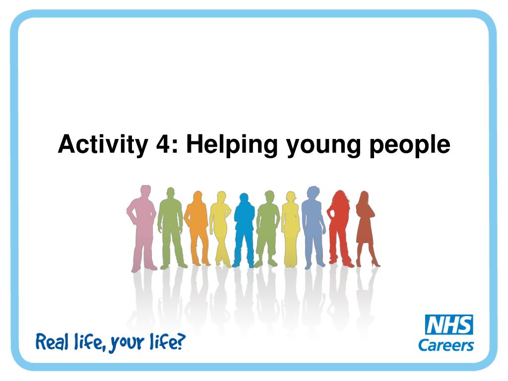 Activity 4: Helping young people. Getting help. Many young people can experience problems. Sometimes you might think you are the only person dealing with your problem, but it’s not true. It’s good to talk things through with someone you can trust – a friend, teacher, parent or carer.