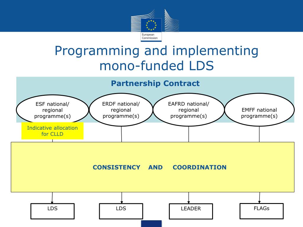Programming and implementing mono-funded LDS Partnership Contract ERDF national/ regional programme(s) EAFRD national/ regional programme(s) EMFF national programme(s) ESF national/ regional programme(s) Indicative allocation for CLLD CONSISTENCY AND COORDINATION Selection committee Selection committee Selection committee Selection committee FLAGs LDS LDS LEADER