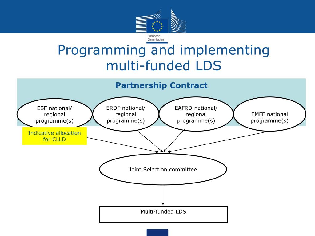 Programming and implementing multi-funded LDS Partnership Contract ERDF national/ regional programme(s) EAFRD national/ regional programme(s) EMFF national programme(s) ESF national/ regional programme(s) Indicative allocation for CLLD Joint Selection committee Multi-funded LDS