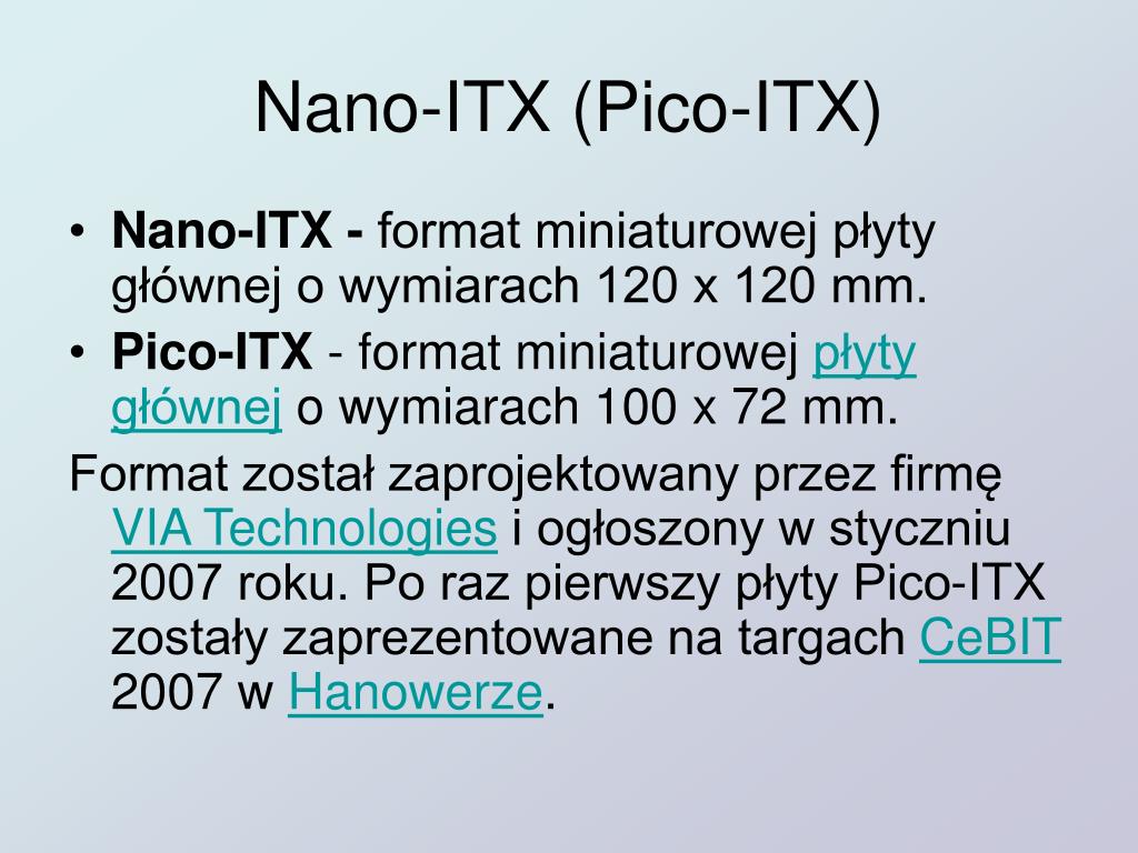 Nano-ITX (Pico-ITX) • Nano-ITX - format miniaturowej płyty głównej o wymiarach 120 x 120 mm. • Pico-ITX - format miniaturowej płyty głównej o wymiarach 100 x 72 mm. Format został zaprojektowany przez firmę VIA Technologies i ogłoszony w styczniu 2007 roku. Po raz pierwszy płyty Pico-ITX zostały zaprezentowane na targach CeBIT 2007 w Hanowerze.