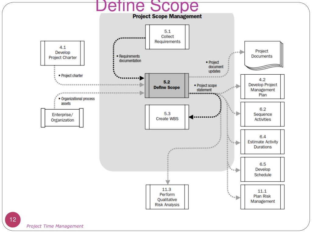 Define scope is the process of developing a detailed description of the project and product. The preparation of a detailed project scope statement is critical to project success and builds upon the major deliverables, assumptions, and constraints that are documented during project initiation. Project Time Management