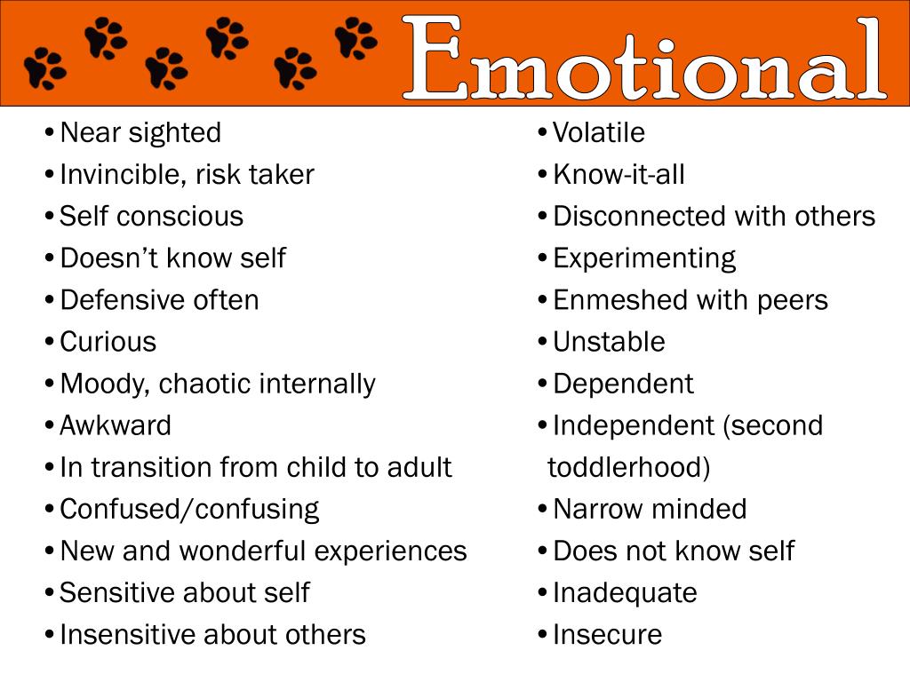 Emotional • Near sighted • Invincible, risk taker • Self conscious • Doesn’t know self • Defensive often • Curious • Moody, chaotic internally • Awkward • In transition from child to adult • Confused/confusing • New and wonderful experiences • Sensitive about self • Insensitive about others • Volatile • Know-it-all • Disconnected with others • Experimenting • Enmeshed with peers • Unstable • Dependent • Independent (second • toddlerhood) • Narrow minded • Does not know self • Inadequate • Insecure