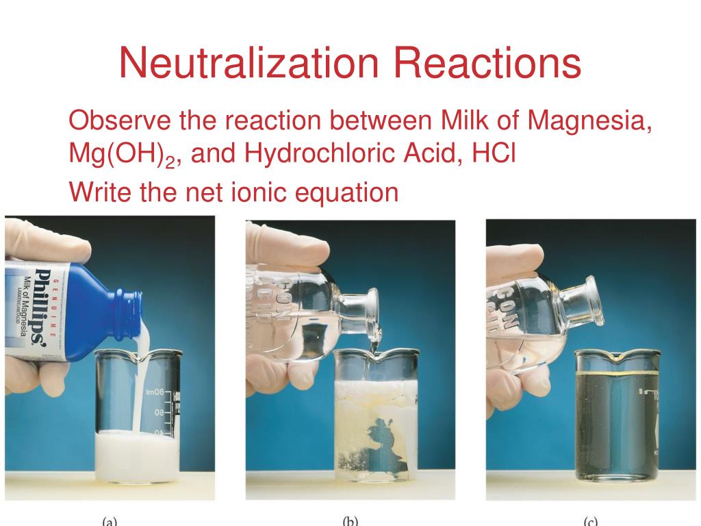 Neutralization Reactions Observe the reaction between Milk of Magnesia, Mg(OH)2, and Hydrochloric Acid, HCl Write the net ionic equation