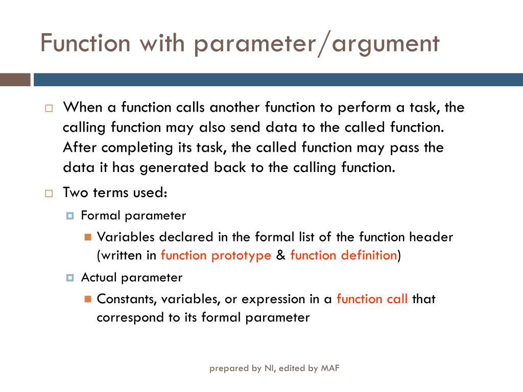 Function with parameter/argument • When a function calls another function to perform a task, the calling function may also send data to the called function. After completing its task, the called function may pass the data it has generated back to the calling function. • Two terms used: • Formal parameter • Variables declared in the formal list of the function header (written in function prototype & function definition) • Actual parameter • Constants, variables, or expression in a function call that correspond to its formal parameter prepared by NI, edited by MAF