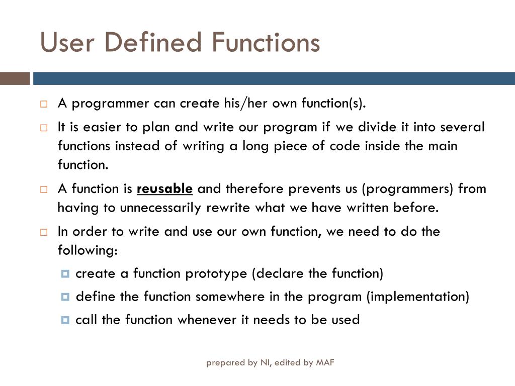 User Defined Functions • A programmer can create his/her own function(s). • It is easier to plan and write our program if we divide it into several functions instead of writing a long piece of code inside the main function. • A function is reusable and therefore prevents us (programmers) from having to unnecessarily rewrite what we have written before. • In order to write and use our own function, we need to do the following: • create a function prototype (declare the function) • define the function somewhere in the program (implementation) • call the function whenever it needs to be used prepared by NI, edited by MAF