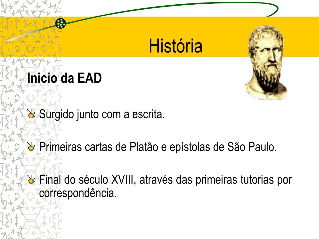 História Inicio da EAD • Surgido junto com a escrita. • Primeiras cartas de Platão e epístolas de São Paulo. • Final do século XVIII, através das primeiras tutorias por correspondência.