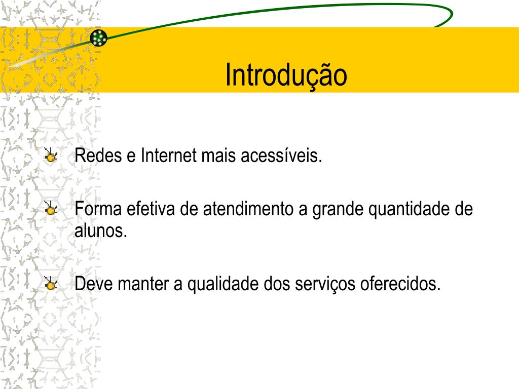 Introdução • Redes e Internet mais acessíveis. • Forma efetiva de atendimento a grande quantidade de alunos. • Deve manter a qualidade dos serviços oferecidos.