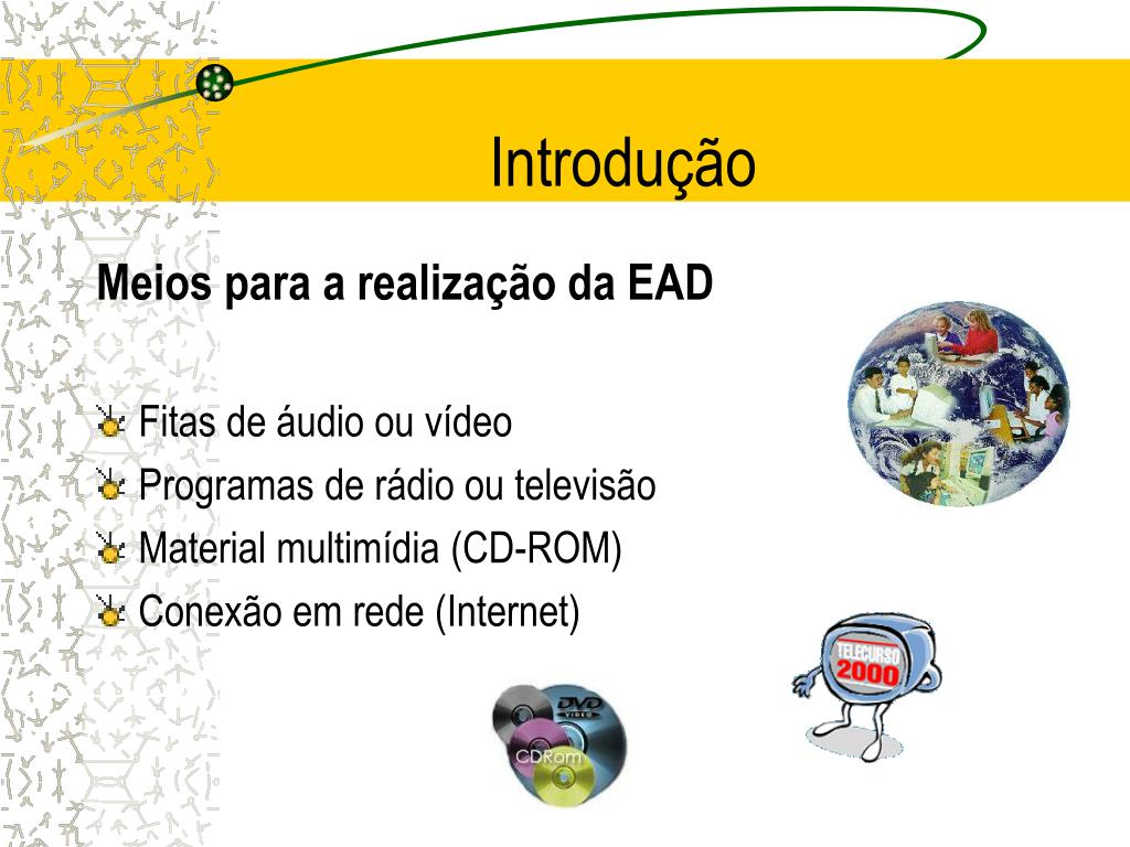 Introdução Meios para a realização da EAD • Fitas de áudio ou vídeo • Programas de rádio ou televisão • Material multimídia (CD-ROM) • Conexão em rede (Internet)