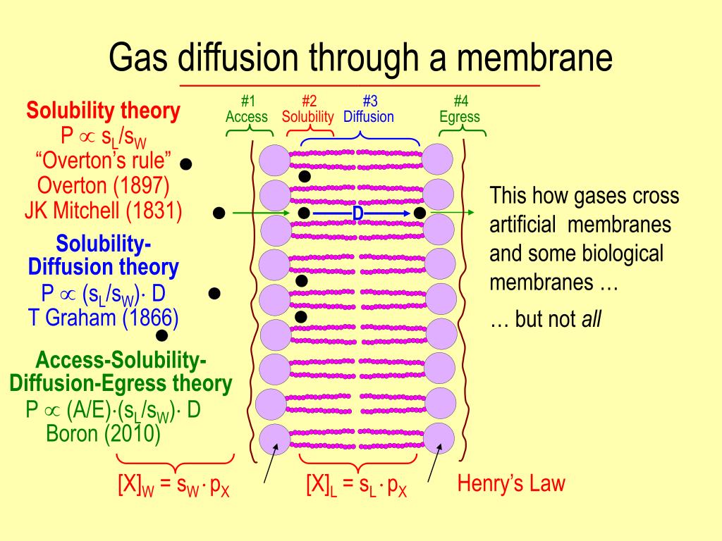 #1 Access #4 Egress #2 Solubility #3 Diffusion [X]W = sWpX [X]L = sLpX Gas diffusion through a membrane Solubility theory P sL/sW “Overton’s rule” Overton (1897) This how gases cross artificial membranes and some biological membranes … JK Mitchell (1831) D Solubility-Diffusion theory P (sL/sW) D T Graham (1866) … but not all Access-Solubility-Diffusion-Egress theory P (A/E)(sL/sW) D Boron (2010) Henry’s Law