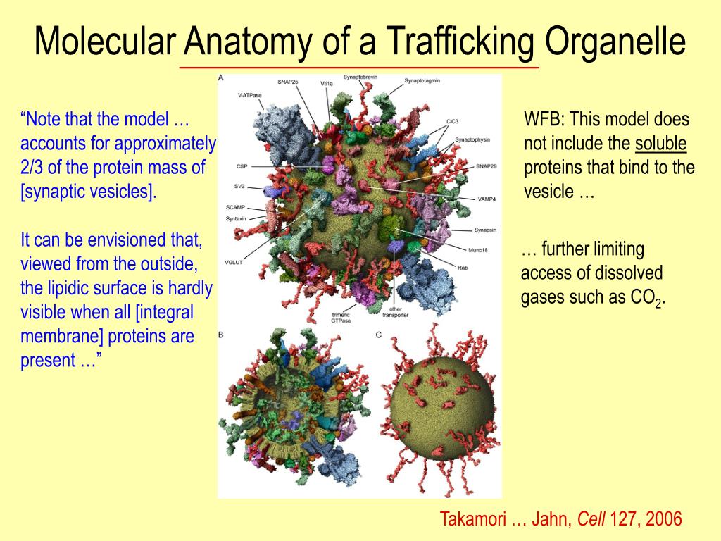 Molecular Anatomy of a Trafficking Organelle “Note that the model … accounts for approximately 2/3 of the protein mass of [synaptic vesicles]. WFB: This model does not include the soluble proteins that bind to the vesicle … It can be envisioned that, viewed from the outside, the lipidic surface is hardly visible when all [integral membrane] proteins are present …” … further limiting access of dissolved gases such as CO2. Takamori … Jahn, Cell 127, 2006