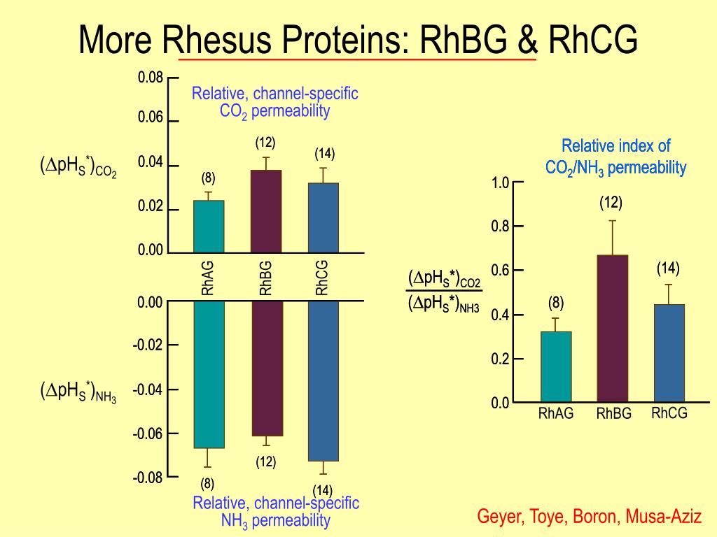 Relative index of CO2/NH3 permeability Relative index of CO2/NH3 permeability 1.0 1.0 (12) (12) 0.8 0.8 (14) (14) (pHS*)CO2 (pHS*)CO2 0.6 0.6 (pHS*)NH3 (pHS*)NH3 (8) (8) 0.4 0.4 0.2 0.2 0.0 0.0 RhCG RhAG RhBG More Rhesus Proteins: RhBG & RhCG 0.08 0.08 Relative, channel-specific CO2 permeability 0.06 0.06 (12) (12) (14) (14) (pHS*)CO2 0.04 0.04 (8) (8) 0.02 0.02 0.00 0.00 RhCG RhAG RhBG 0.00 0.00 -0.02 -0.02 (pHS*)NH3 -0.04 -0.04 -0.06 -0.06 (12) (12) -0.08 -0.08 (8) (8) (14) (14) Relative, channel-specific NH3 permeability Geyer, Toye, Boron, Musa-Aziz