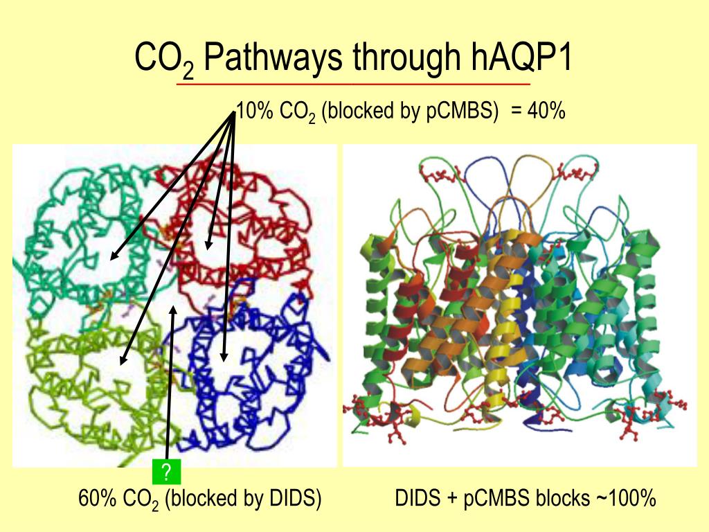 ? CO2 Pathways through hAQP1 10% CO2 (blocked by pCMBS) = 40% 60% CO2 (blocked by DIDS) DIDS + pCMBS blocks ~100%