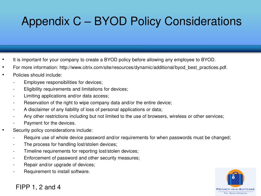 Appendix C – BYOD Policy Considerations • It is important for your company to create a BYOD policy before allowing any employee to BYOD. • For more information: http://www.citrix.com/site/resources/dynamic/additional/byod_best_practices.pdf. • Policies should include: • Employee responsibilities for devices; • Eligibility requirements and limitations for devices; • Limiting applications and/or data access; • Reservation of the right to wipe company data and/or the entire device; • A disclaimer of any liability of loss of personal applications or data; • Any other restrictions including but not limited to the use of browsers, wireless or other services; • Payment for the devices. • Security policy considerations include: • Require use of whole device password and/or requirements for when passwords must be changed; • The process for handling lost/stolen devices; • Timeline requirements for reporting lost/stolen devices; • Enforcement of password and other security measures; • Repair and/or upgrade of devices; • Requirement to install software.