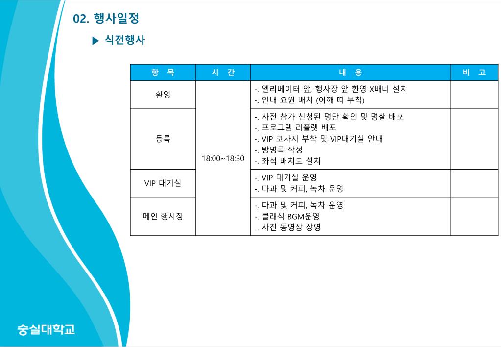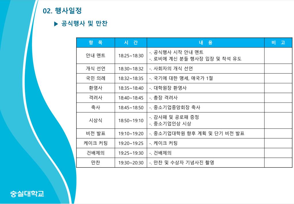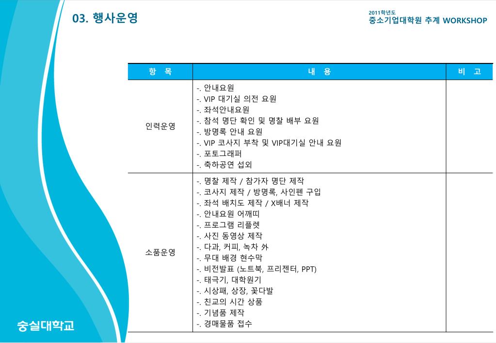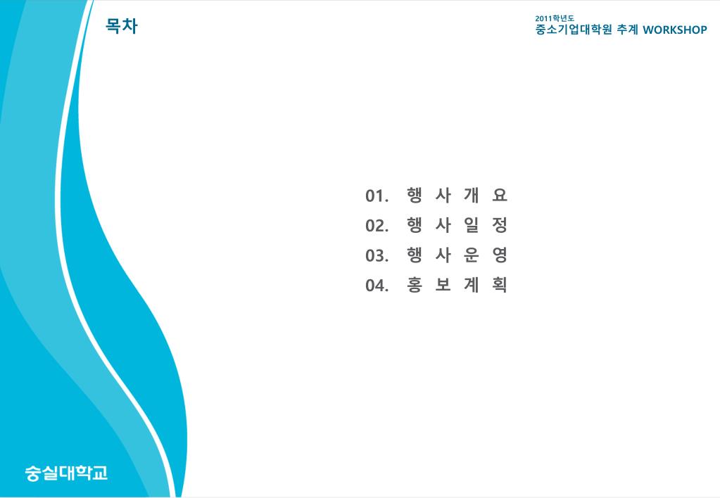 2011 학년도 중소기업대학원 추계 WORKSHOP. 목차. 01. 행 사 개 요 02. 행 사 일 정 03. 행 사 운 영 04. 홍 보 계 획. 2011 년 숭실대학교 중소기업대학원을 빛낸. 자랑스런 중소기업인상 시상식. 2011 학년도 중소기업대학원 추계 WORKSHOP. 01. 행사개요. 02. 행사일정. ▶ 식전행사. 02. 행사일정. ▶ 공식행사 및 만찬. 02. 행사일정. ▶ 친교의 시간. 2011 학년도