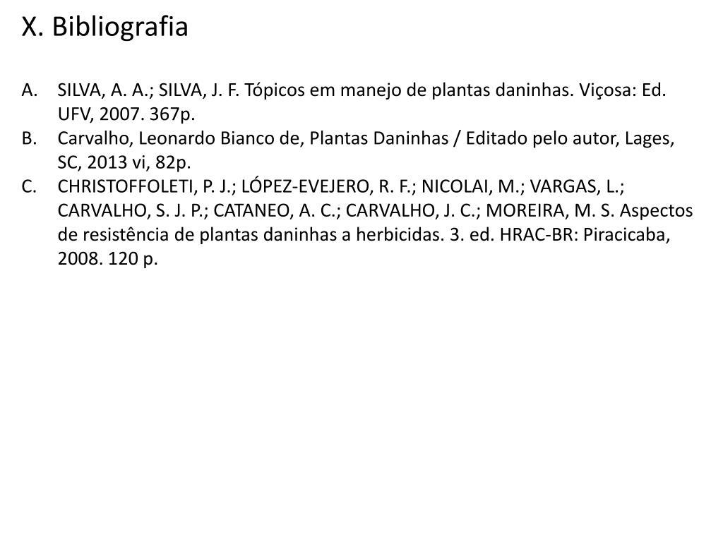X. Bibliografia SILVA, A. A.; SILVA, J. F. Tópicos em manejo de plantas daninhas. Viçosa: Ed. UFV, 2007. 367p. Carvalho, Leonardo Bianco de, Plantas Daninhas / Editado pelo autor, Lages, SC, 2013 vi, 82p. CHRISTOFFOLETI, P. J.; LÓPEZ-EVEJERO, R. F.; NICOLAI, M.; VARGAS, L.; CARVALHO, S. J. P.; CATANEO, A. C.; CARVALHO, J. C.; MOREIRA, M. S. Aspectos de resistência de plantas daninhas a herbicidas. 3. ed. HRAC-BR: Piracicaba, 2008. 120 p.