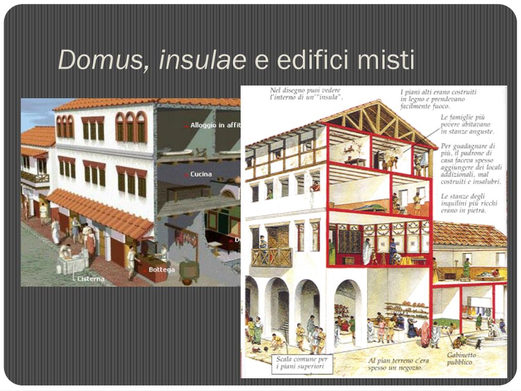 E le case del popolo? • Le domus, come suggerisce il nome, erano le case del dominus, ossia del padrone, del nobile. • Ma sappiamo che Roma era molto popolata e non tutti potevano permettersi una casa come quelle che abbiamo appena visto. • Il popolo abitava quindi in grandi condomini, detti insulae, lo stesso termine che si usava per gli isolati, i quartieri che dividevano la città. • Erano alti anche 6 o 7 piani, con molte parti in legno. Spesso infatti bruciavano, anche se c’erano leggi che proibivano di accendere fuochi dentro casa. • Per questo le taverne, una sorta di fast foodsandavano molto di moda.