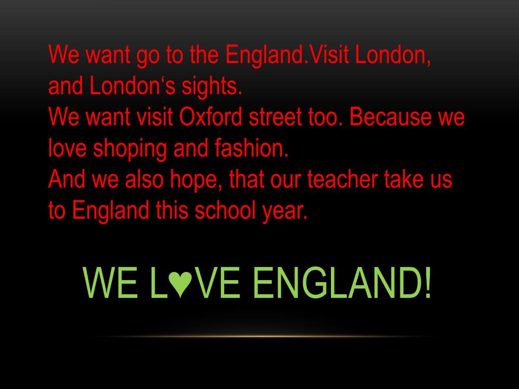 Wewant go to theEngland.Visit London, and London‘ssights. Wewantvisit Oxford street too. Becausewe love shopingand fashion. And wealso hope, thatourteachertakeus to Englandthisschoolyear. WE L♥VE ENGLAND!