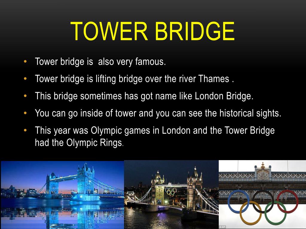 TOWER BRIDGE • Tower bridgeisalsovery famous. • Tower bridgeislifting bridgeovertheriverThames . • Thisbridgesometimes has gotnamelike London Bridge. • Youcan go insideoftower and youcanseethehistoricalsights. • ThisyearwasOlympicgames in London and the Tower Bridgehad theOlympicRings.