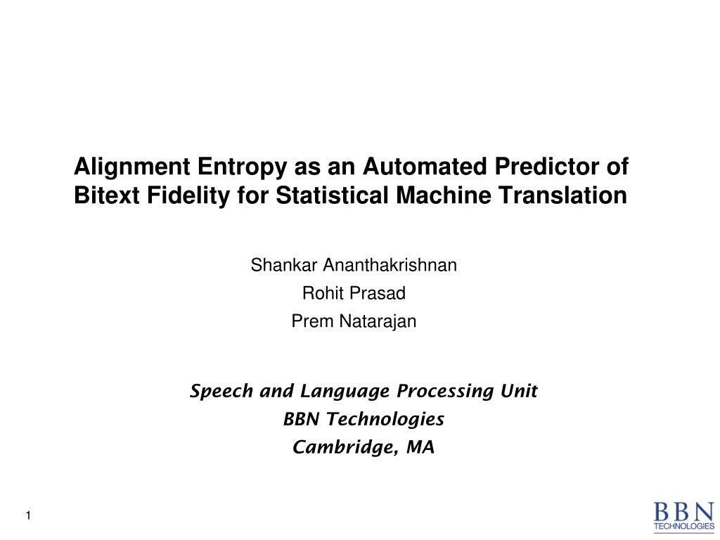 Alignment Entropy as an Automated Predictor of Bitext Fidelity for Statistical Machine Translation Shankar Ananthakrishnan Rohit Prasad Prem Natarajan Speech and Language Processing Unit BBN Technologies Cambridge, MA
