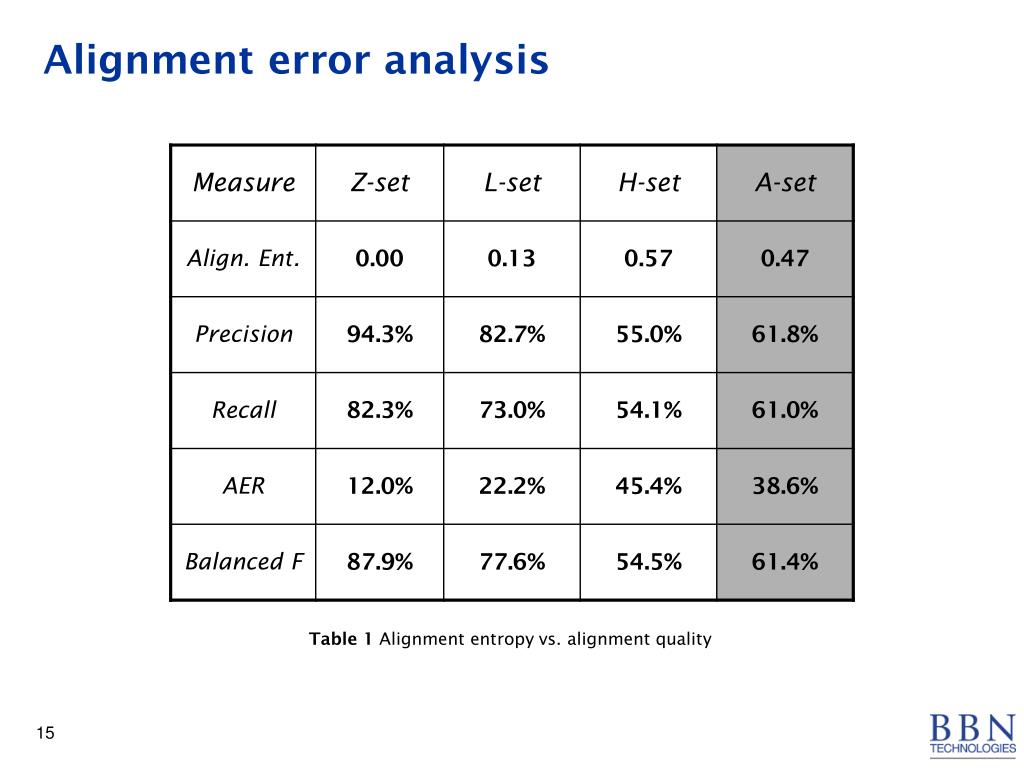 Translation quality analysis Table 2 Alignment entropy vs. translation quality