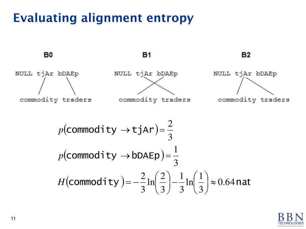 Alignment entropy • Uncertainty of a link in the Viterbi alignment • Higher uncertainty implies poorer alignment? • Basis for automated alignment quality metric • Need a probability distribution over alignments • Different contexts for a given sentence pair • Estimate a multinomial distribution over word alignments • Bootstrapping simulates different contexts • Resample original bitext with replacement