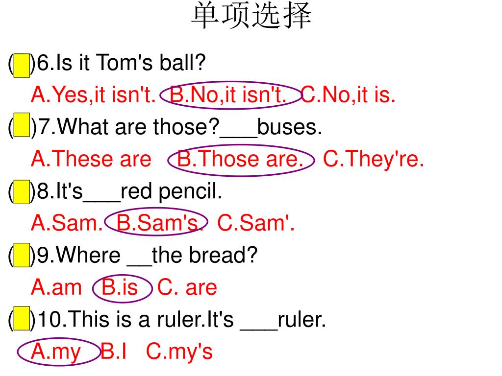 单项选择 (B)6.Is it Tom's ball? A.Yes,it isn't. B.No,it isn't. C.No,it is. (C)7.What are those?___buses. A.These are B.Those are. C.They're. (B)8.It's___red pencil. A.Sam. B.Sam's. C.Sam'. (B)9.Where __the bread? A.am B.is C. are (A)10.This is a ruler.It's ___ruler. A.my B.I C.my's