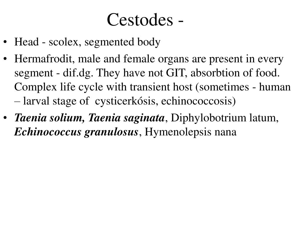 Cestodes - • Head - scolex, segmented body • Hermafrodit, male and female organs are present in every segment - dif.dg. They have not GIT, absorbtion of food. Complex life cycle with transient host (sometimes - human – larval stage of cysticerkósis, echinococcosis) • Taenia solium, Taenia saginata, Diphylobotrium latum, Echinococcus granulosus, Hymenolepsis nana