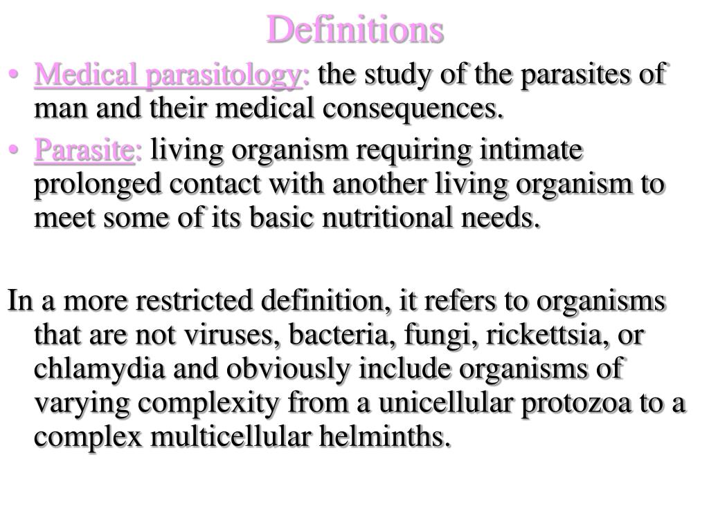 Definitions Medical parasitology: the study of the parasites of man and their medical consequences. Parasite: living organism requiring intimate prolonged contact with another living organism to meet some of its basic nutritional needs. In a more restricted definition, it refers to organisms that are not viruses, bacteria, fungi, rickettsia, or chlamydia and obviously include organisms of varying complexity from a unicellular protozoa to a complex multicellular helminths.