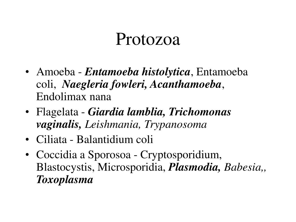 Protozoa • Amoeba - Entamoeba histolytica, Entamoeba coli, Naegleria fowleri, Acanthamoeba, Endolimax nana • Flagelata - Giardia lamblia, Trichomonas vaginalis,Leishmania, Trypanosoma • Ciliata - Balantidium coli • Coccidia a Sporosoa - Cryptosporidium, Blastocystis, Microsporidia, Plasmodia, Babesia,, Toxoplasma