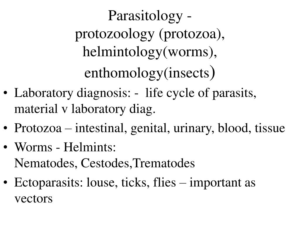 Parasitology - protozoology (protozoa), helmintology(worms), enthomology(insects) • Laboratory diagnosis: - life cycle of parasits, material v laboratory diag. • Protozoa – intestinal, genital, urinary, blood, tissue • Worms - Helmints: Nematodes, Cestodes,Trematodes • Ectoparasits: louse, ticks, flies – important as vectors