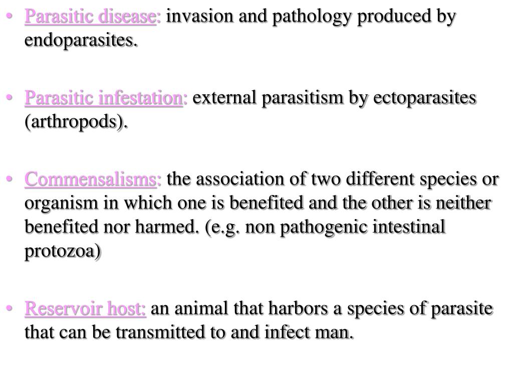 Parasitic disease: invasion and pathology produced by endoparasites. Parasitic infestation: external parasitism by ectoparasites (arthropods). Commensalisms: the association of two different species or organism in which one is benefited and the other is neither benefited nor harmed. (e.g. non pathogenic intestinal protozoa) Reservoir host: an animal that harbors a species of parasite that can be transmitted to and infect man.