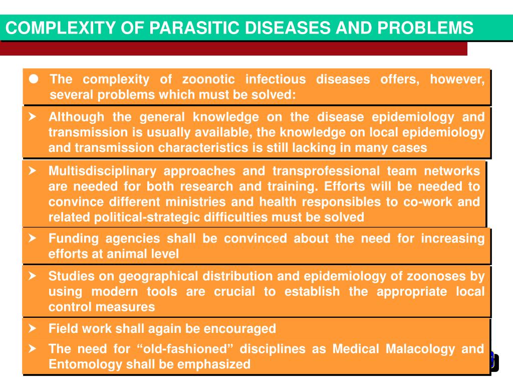 DPUV COMPLEXITY OF PARASITIC DISEASES AND PROBLEMS • The complexity of zoonotic infectious diseases offers, however, several problems which must be solved: • Although the general knowledge on the disease epidemiology and transmission is usually available, the knowledge on local epidemiology and transmission characteristics is still lacking in many cases • Multisdisciplinary approaches and transprofessional team networks are needed for both research and training. Efforts will be needed to convince different ministries and health responsibles to co-work and related political-strategic difficulties must be solved • Funding agencies shall be convinced about the need for increasing efforts at animal level • Studies on geographical distribution and epidemiology of zoonoses by using modern tools are crucial to establish the appropriate local control measures • Field work shall again be encouraged • The need for “old-fashioned” disciplines as Medical Malacology and Entomology shall be emphasized