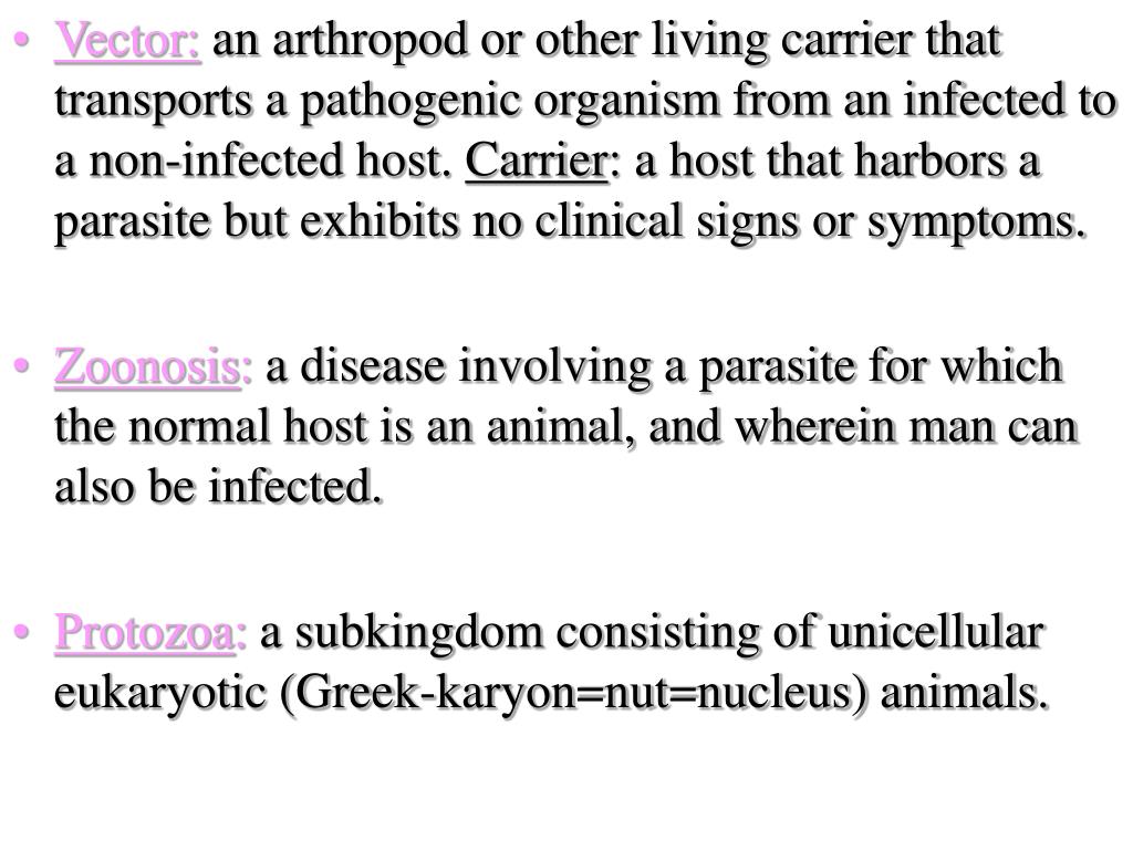Vector: an arthropod or other living carrier that transports a pathogenic organism from an infected to a non-infected host. Carrier: a host that harbors a parasite but exhibits no clinical signs or symptoms. Zoonosis: a disease involving a parasite for which the normal host is an animal, and wherein man can also be infected. Protozoa: a subkingdom consisting of unicellular eukaryotic (Greek-karyon=nut=nucleus) animals.