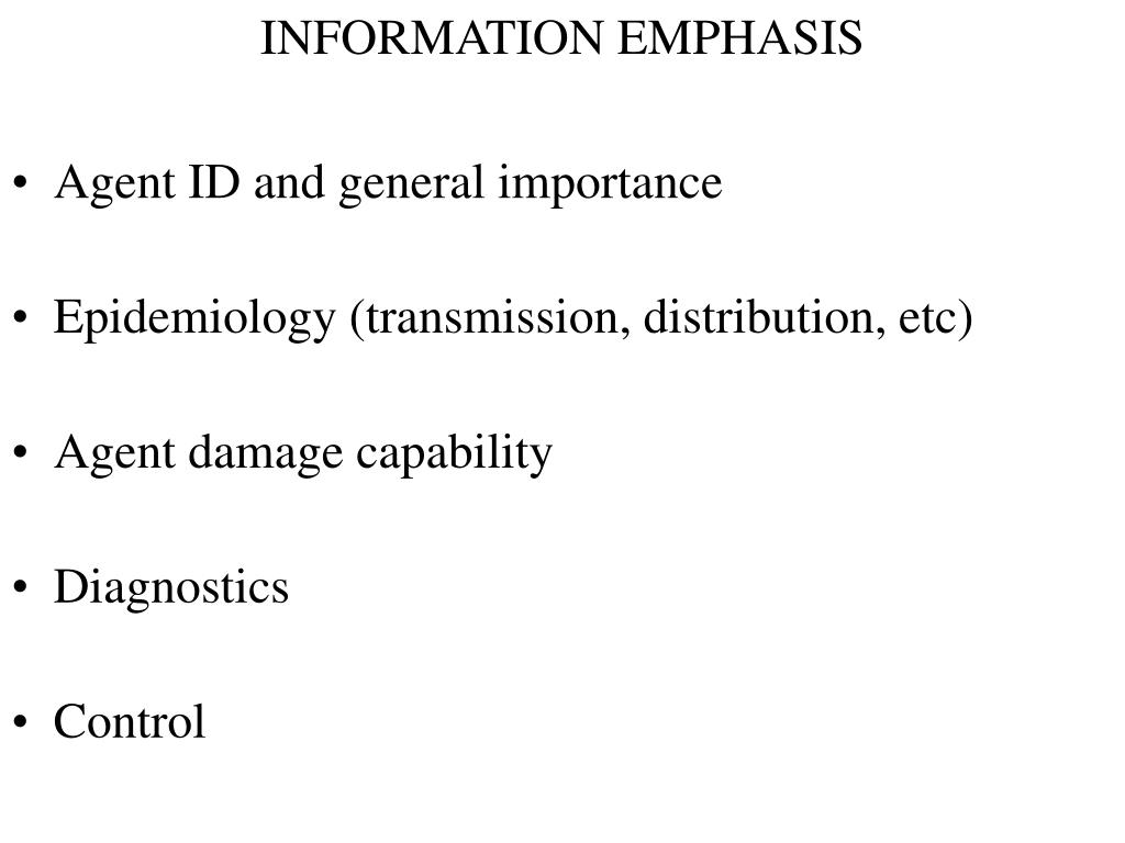 INFORMATION EMPHASIS Agent ID and general importance Epidemiology (transmission, distribution, etc) Agent damage capability Diagnostics Control