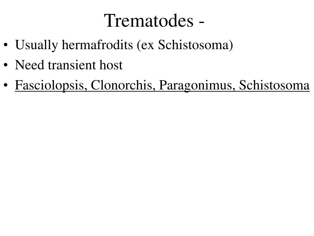 Trematodes - • Usually hermafrodits (ex Schistosoma) • Need transient host • Fasciolopsis, Clonorchis, Paragonimus, Schistosoma