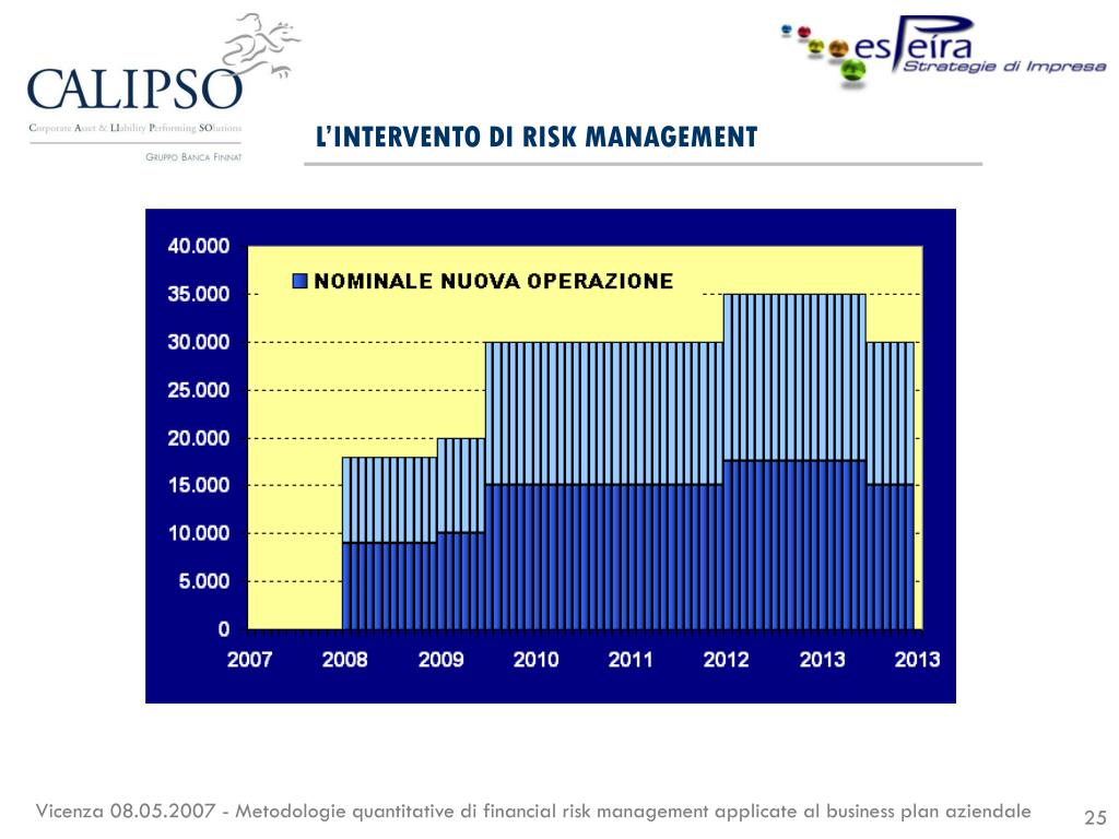 CONCLUSIONE • Un approccio strutturato e l’impiego di metodologie quantitative hanno permesso di: • Acquisire un maggior livello di consapevolezza del rischio tasso di interesse • Modulare gli aspetti finanziari del progetto in modo più efficace sia nell’interesse dell’azienda che del finanziatore • Avere coerenza tra i livelli di rischio ritenuti accettabili dall’azienda e le strategie di copertura effettuate